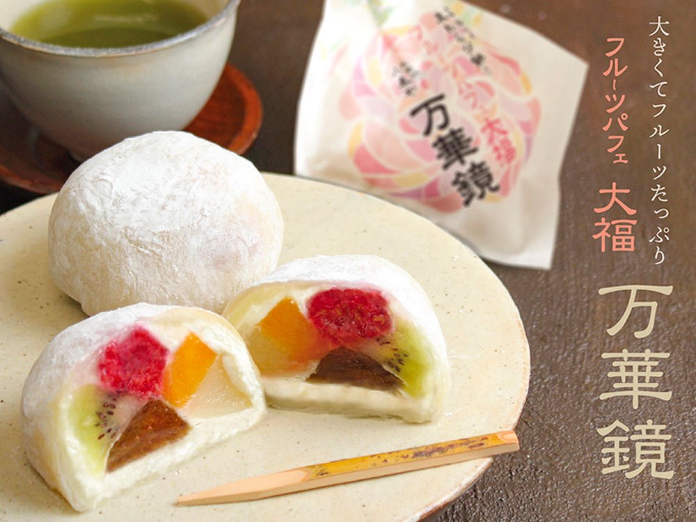4種類の大きなフルーツ(ベリー・マンゴー・白桃・キウイ)を白餡と小春や特製クリーム、そして自慢のやわらかいふわふわの大福で包んでいます。