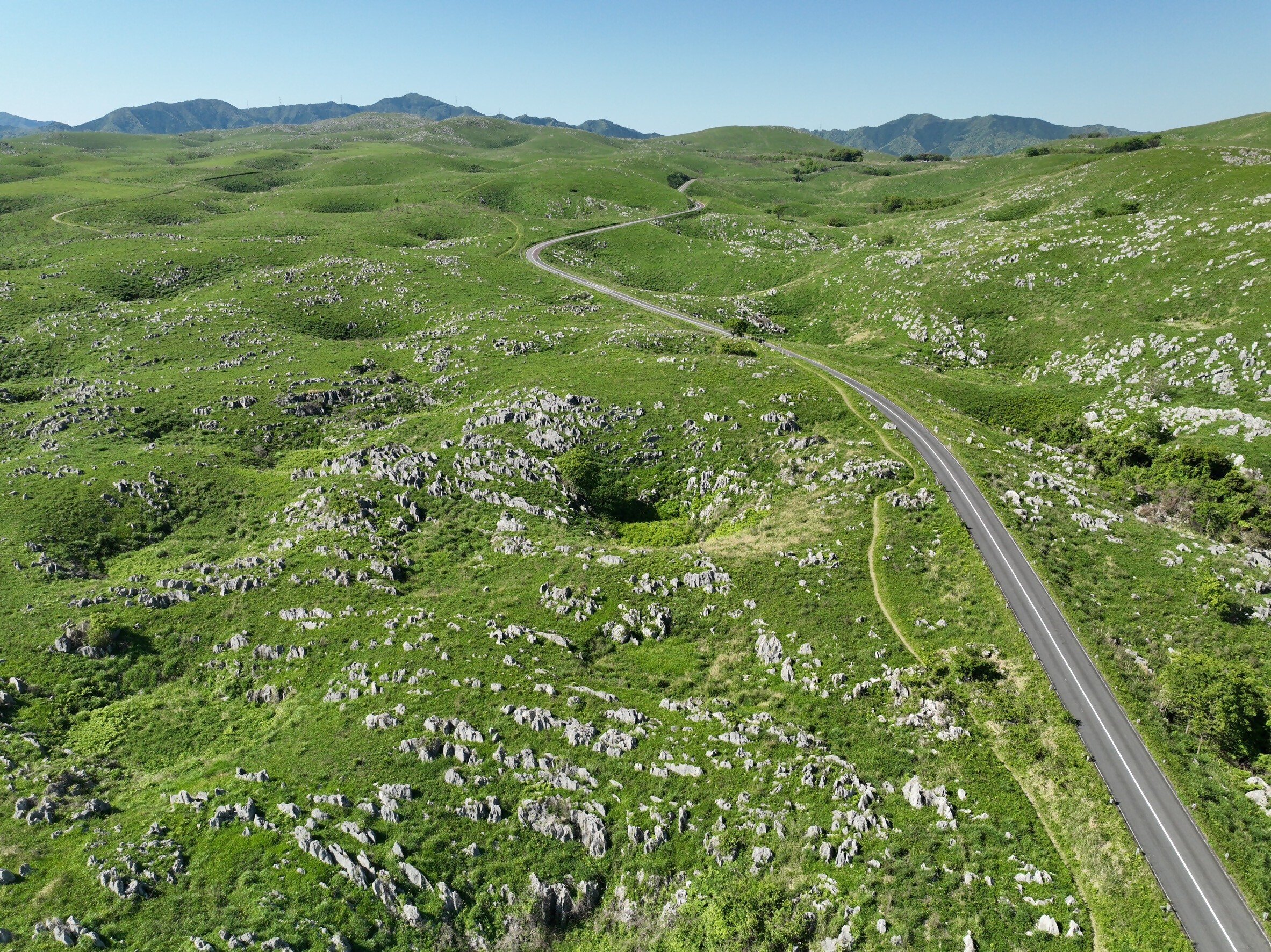 日本最大のカルスト台地。夏の緑の大地はもちろん、秋の夕日できらきら輝くススキに覆われた大地も絶景。