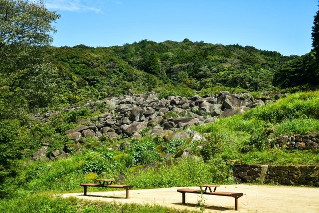 山中に突然現れる圧巻の岩海。昼間の豪快な様子だけでなく、夕日に照らされた岩々の光景もロマンチック。