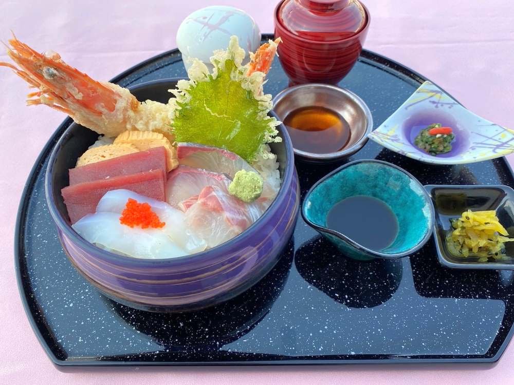 4種の新鮮なお刺身と大海老の天婦羅が一つの丼になりました。
