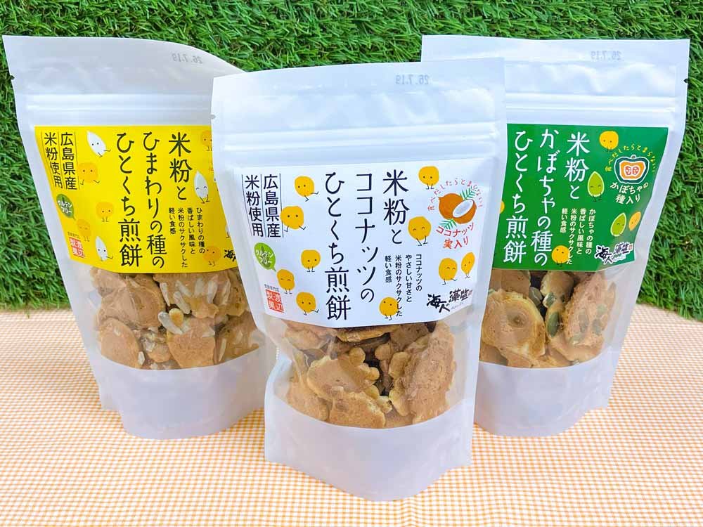 グルテンフリー。広島県産米粉や藻塩を使用。米粉ならではのパリサクッとした食感!ココナッツ、かぼちゃの種、ひまわりの種それぞれとの相性抜群です。