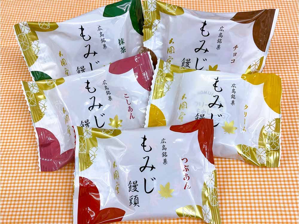 広島土産定番のもみじまんじゅう。バラ売りだけでなく、3個入や5個入にラッピングして販売中。当店一番人気!!