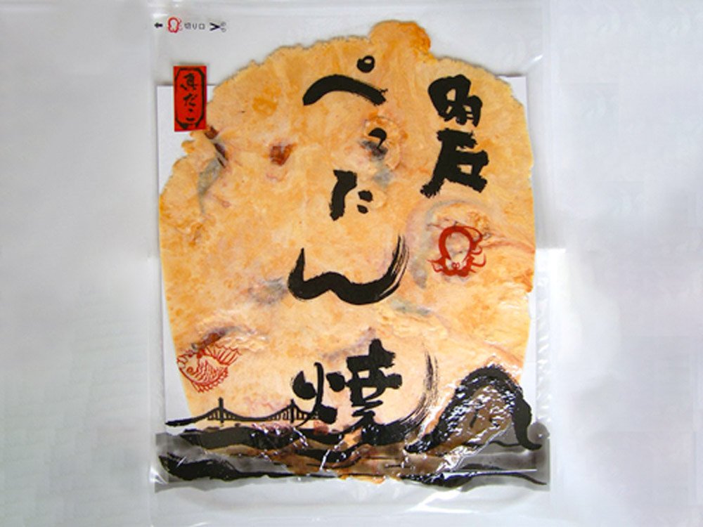 地元の明石産の「まえもん」を使って明石のぺったん焼を作っています。特製だれで味付けした生地と一緒に専用のプレス機でギューっとぺったんこに!この巨大超薄焼きせんべいが「明石ぺったん焼」です。