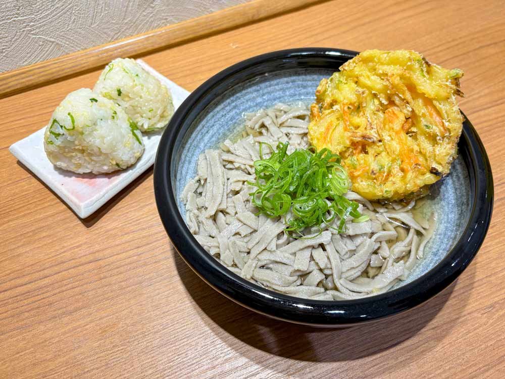 そば粉100%でつなぎが入ってない立川そばは、太くて短くなっています。モチモチした食感がクセになる。天かすとだしを混ぜたたぬきおむすびも一緒にどうぞ。