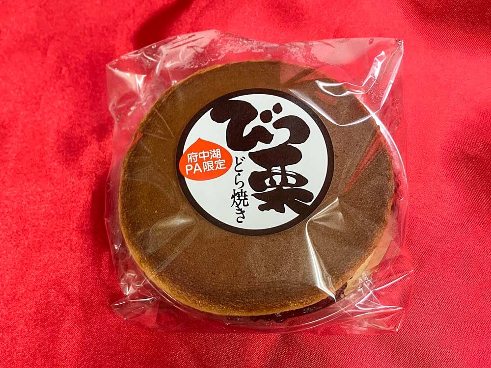 香川県でも有名な和菓子屋「森上屋のどら焼き」。あんこたっぷりに栗が丸ごと入った贅沢などら焼きで、府中湖PA(下り)限定品です。
