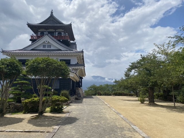 瀬戸内海に面したロケーションに位置する城。展望台から瀬戸内海や紙のまちを感じる紙製品工場が見られる。