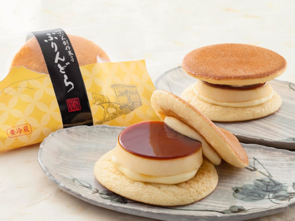 阿蘇小国ジャージー牛乳入りのコク深いプリンに、ほろ苦いカラメルソースでアクセント。ふんわりパンケーキ風のどら焼きで、カスタードクリームとあわせてサンドしています。