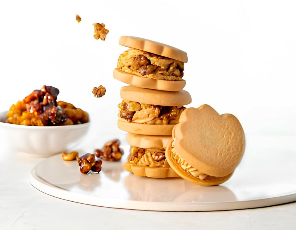 祝うてサンドは、博多のお祝いから誕生したお菓子です。かわいい手形のクッキーにほろ苦いキャラメルクリームとキャラメリゼしたくるみをサンドしています。