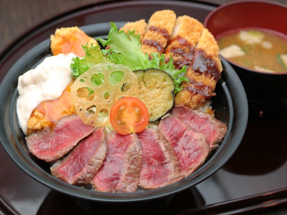 熊本を代表する食材(あか牛・りんどうポーク・うまか赤どり)を1つのオムライスで1度で味わえる贅沢なオムライスを是非お召し上がりください。