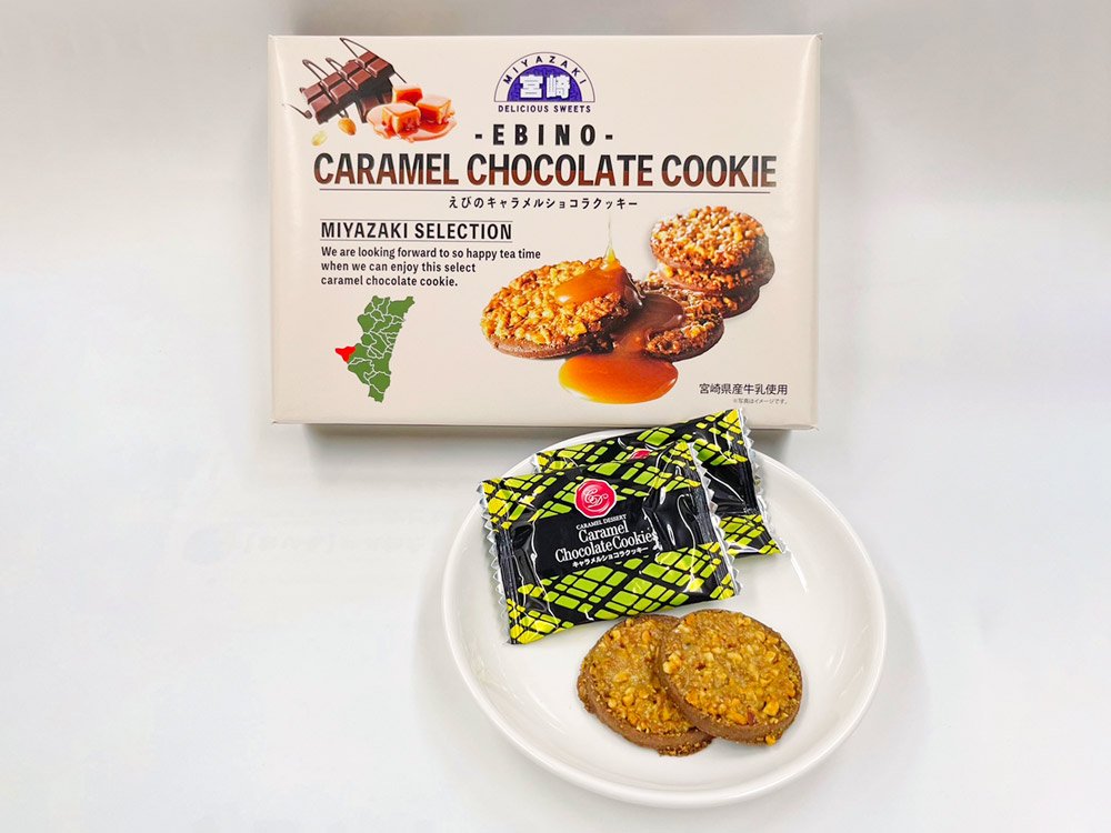 宮崎県産の牛乳を使用した商品です。キャラメルとショコラクッキーがクセになる味です!えびのキャラメルショコラクッキー大 1296円(税込)もあります。