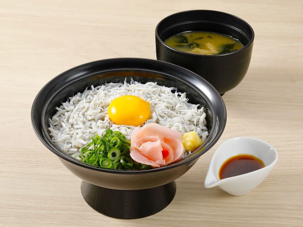 国産のしらすを使用したどんぶり。卵と生姜が合います。小さいサイズのミニしらすご飯もございます。