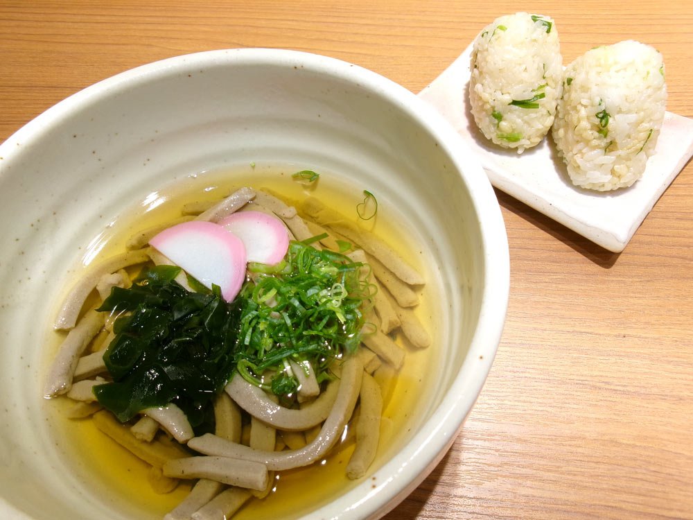 そば粉100%でつなぎが入ってない立川そばは、太くて短くなっています。モチモチした食感がクセになる。天かすとだしを混ぜたたぬきおむすびも一緒にどうぞ。