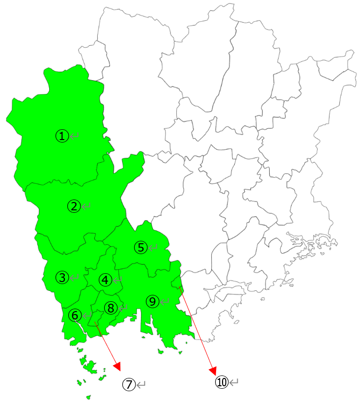岡山県西部地域の計10市町を指します(下記着色箇所)
