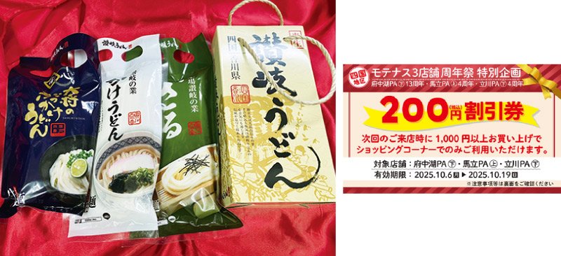 2025年10月6日(月曜)~10月19日(日曜)の期間、E11 高松自動車道 府中湖PA(下り線)と、E32 高知自動車道 馬立PA(上り線)、立川PA(下り線)にて、モテナスフェアを開催します。