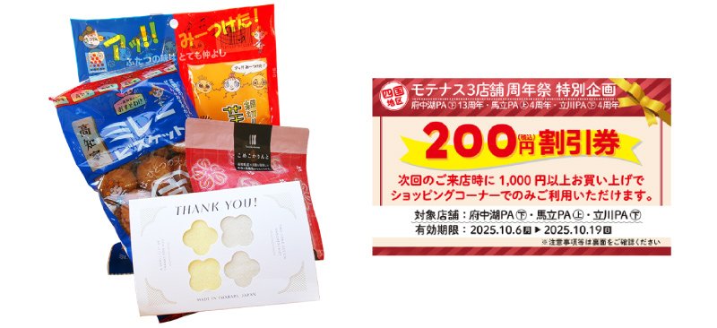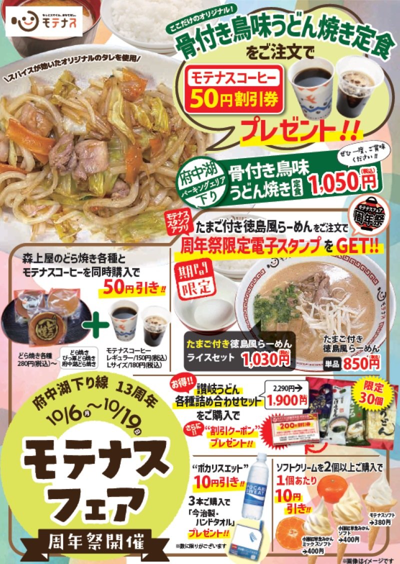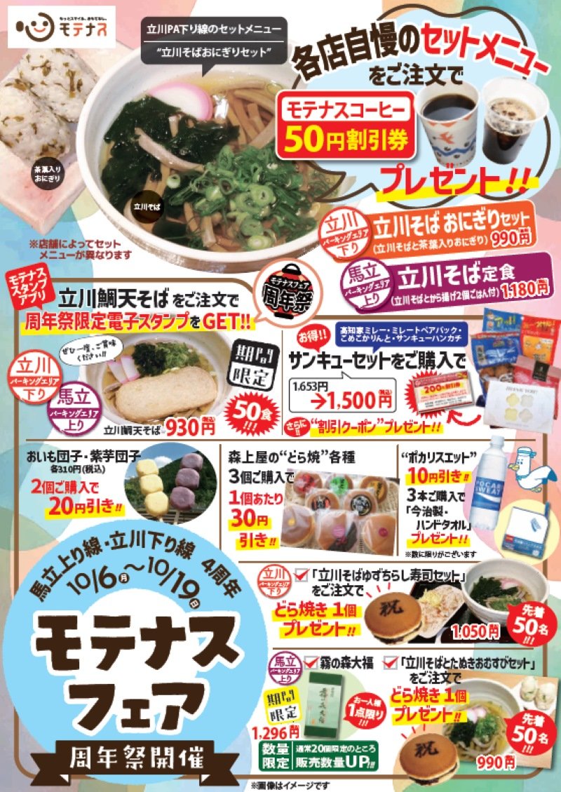 府中湖PA(下り線)、馬立PA(上り線)、立川PA(下り線)でモテナスフェア開催!おトクにお食事・お買物を楽しもう!