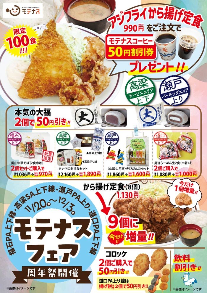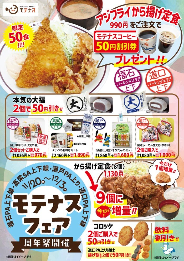 2025年11月20日(木曜)~12月3日(水曜)、E73 岡山自動車道 高梁SA(上下線)、E2 山陽自動車道 福石PA(上下線)、瀬戸PA(上り線)、道口PA(上下線)の7店舗にて、利用者の方々への日頃のご愛顧に感謝を込めて、モテナスフェアを開催します。