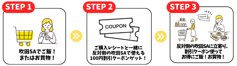 お食事・お買い物をされたお客さまにお得なクーポンをプレゼントいたしますので、この機会にぜひ吹田SA(上下線)にお越しください。