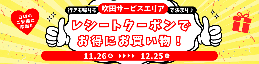2025年11月26日(水曜)から12月25日(木曜)まで、E1 名神高速道路 吹田SA(上下線)で「レシートクーポンでお得にお買い物キャンペーン」を開催いたします。