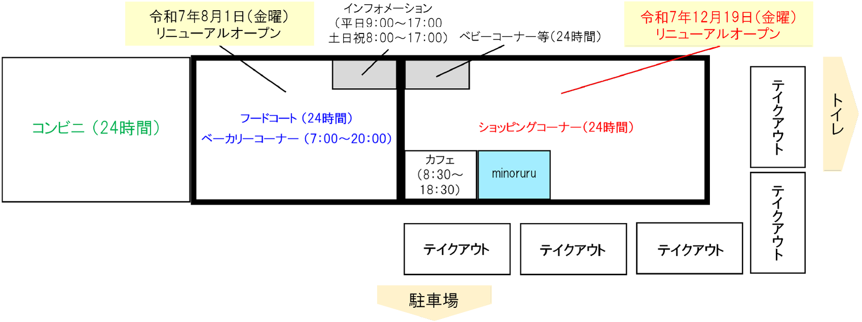 フードコートやコンビニ等、ショッピングコーナー以外のコーナーは通常営業となります。