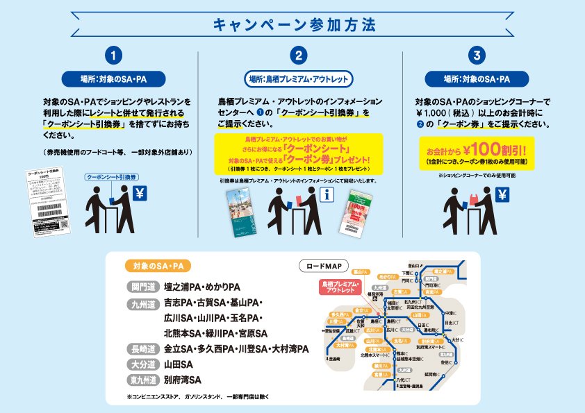 対象サービスエリア(SA)・パーキングエリア(PA)でお買い物のうえ、鳥栖プレミアム・アウトレットへお出かけいただくとお得なクーポンをプレゼント、お帰り時も対象SA・PAでのお買い物がお得になるキャンペーンです。
