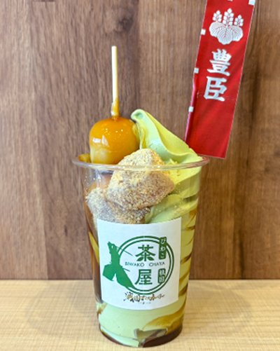 | 戦国の世に花開いた「茶の湯文化」をサンデーで表現しました。地元朝宮茶の本格抹茶ソフトに大玉みたらし団子ときな粉が香ばしいわらび餅が美味です。 | ||