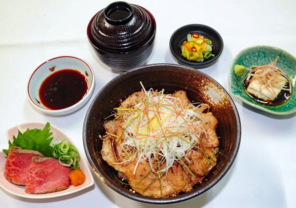 | 奈良県産ヤマトポークを炙り照焼きにしてご飯にのせました。近江牛のローストビーフとの競演で勝利の美食を表現しました。地元比叡ゆばの刺身と一緒にどうぞ。 | ||