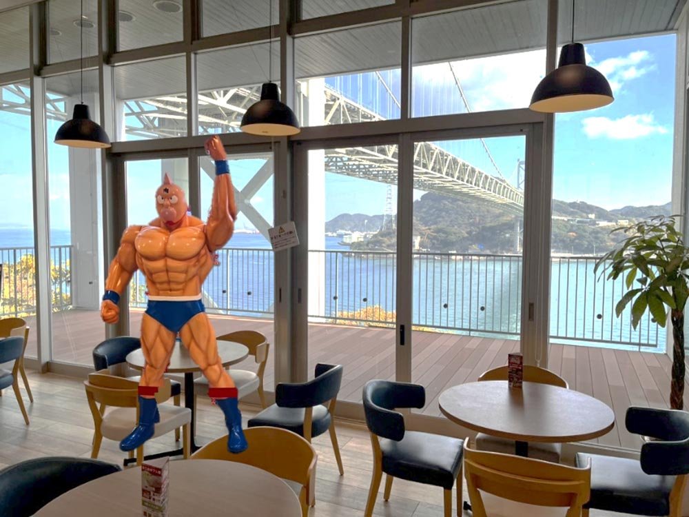 壇之浦PAの景観を活かし、関門海峡を背景にキン肉マンの等身大フィギュアを撮影できるフォトスポットを設置するほか、昨年好評を得たキン肉マンフェア限定オリジナルの2025Ver.Tシャツ、トートバックを数量限定で販売します。