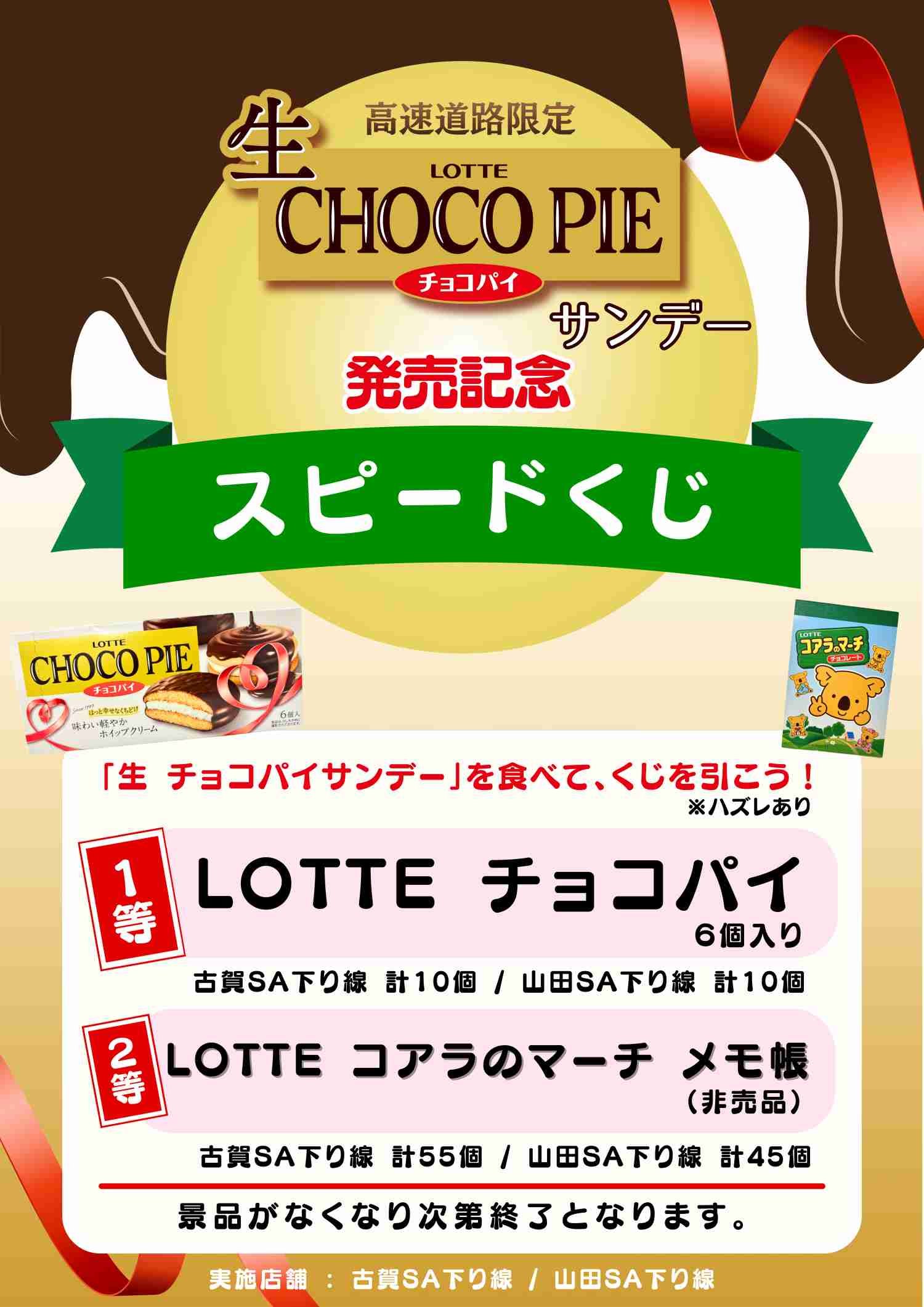 | 【1等】 | LOTTE チョコパイ 6個入 | 古賀SA(下り線):計10個 | / | 山田SA(下り線):計10個 |