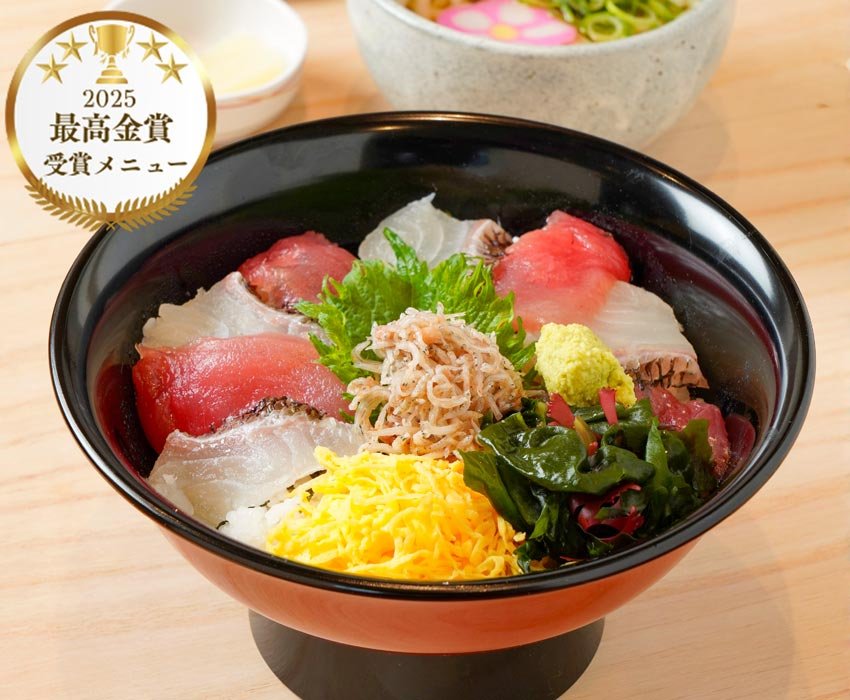 和歌山県産のマグロと鯛に、自家製の梅ちりめんを添えた紅白の華やかな丼。鮮度抜群のマグロは、地元・湯浅醤油の旨味でさらに引き立ちます。※価格は全て税込です。