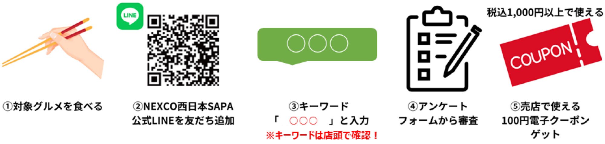 なお、お客さま投票にご参加いただいた方には、関西地区のSA・PAでご利用いただける100円引き電子クーポンを進呈しますので、この機会にぜひ対象のSA・PAにお越しいただき、自慢の名物グルメをお召し上がりください。