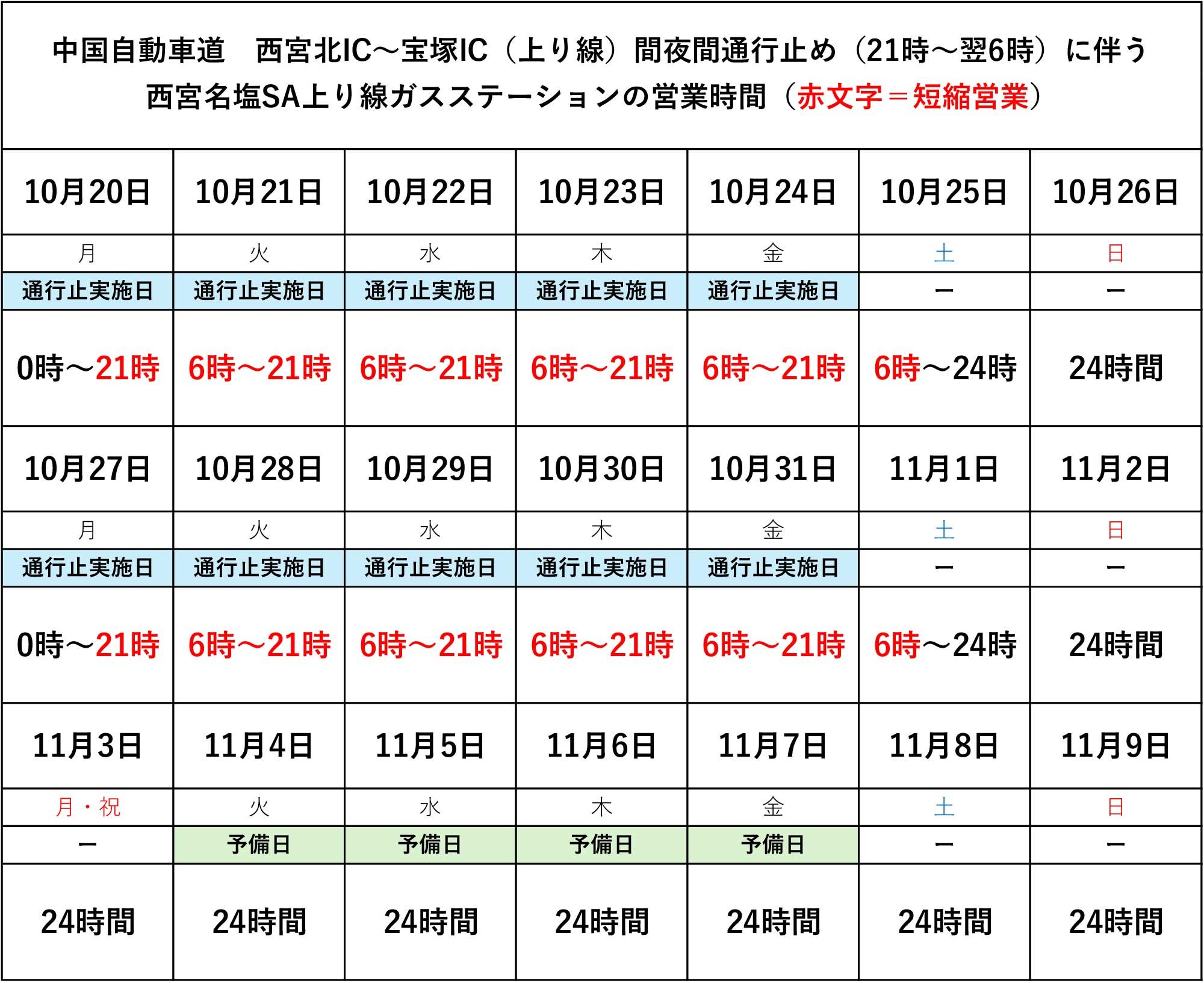 E2A 中国自動車道 西宮名塩SA(上り線)では、西宮北インターチェンジ~宝塚インターチェンジ間(上り線)の夜間通行止め(21時~6時)に伴い、以下のとおりガスステーションの営業時間を変更させていただきます。
