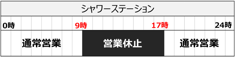 E1 名神高速道路 草津PA(上り線)のシャワーステーションでは、清掃・点検に伴い、下記の通り営業を休止いたします。