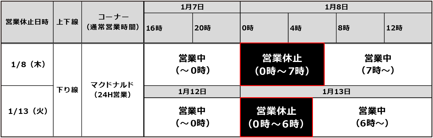 E1 名神高速道路 大津SA(下り線)のマクドナルドでは設備メンテナンス作業に伴い、下記のとおり営業を一時休止いたします。