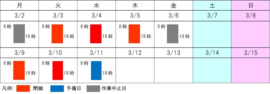 ※(2026.3.5更新)3月2日、6日は天候不良により作業を中止するため、予備日(3月9日~10日)を利用して昼間閉鎖を実施します。