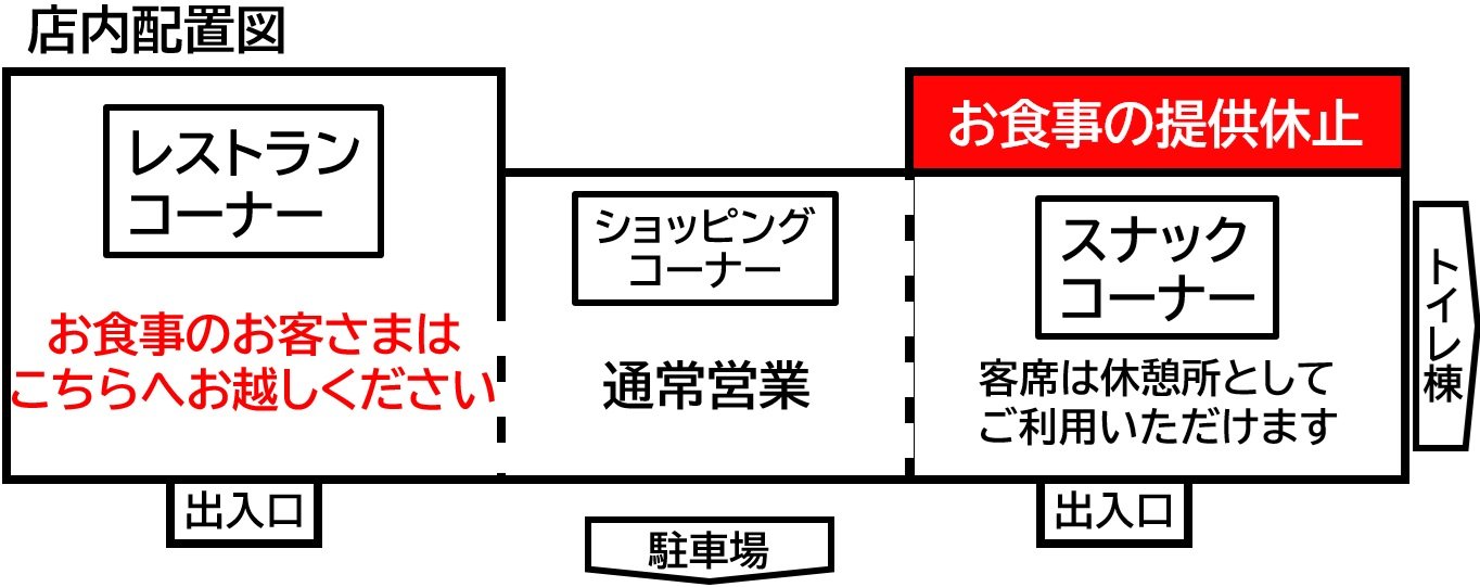 なお、休止中はレストランコーナーにおいて、お食事のご注文の受付・ご提供を行います。また、スナックコーナーの客席については、休憩所としてご利用いただけます。