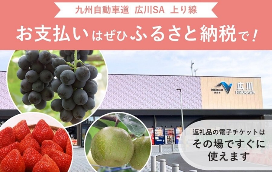 電子チケットは、広川SA(上り線)のショッピングコーナーでご利用でき、広川町のいちごやお茶等の地場産品と、明太子やもつ鍋等の福岡県共通返礼品にご利用いただけます。