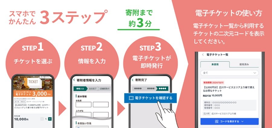 ・寄附額: 5,000円(電子チケット1,500円分)、10,000円(電子チケット3,000円分)、17,000円(電子チケット5,000円分)、34,000円(電子チケット10,000円分)