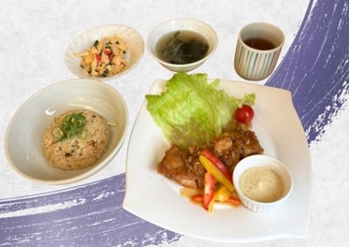 但馬どりに淡路島産玉ねぎを使用したタルタルソースをかけた油淋鶏に、淡路島産レタスを添えた兵庫県の食材をいいとこどり(鶏)した定食です。
